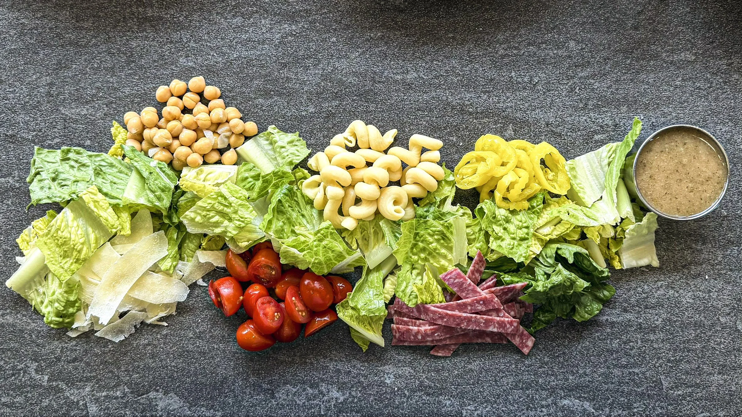 Romaine / Salami / Grape Tomato / Banana Peppers / Shaved Parmesan / Chick Peas / Pasta / Fiddlehead Vinaigrette