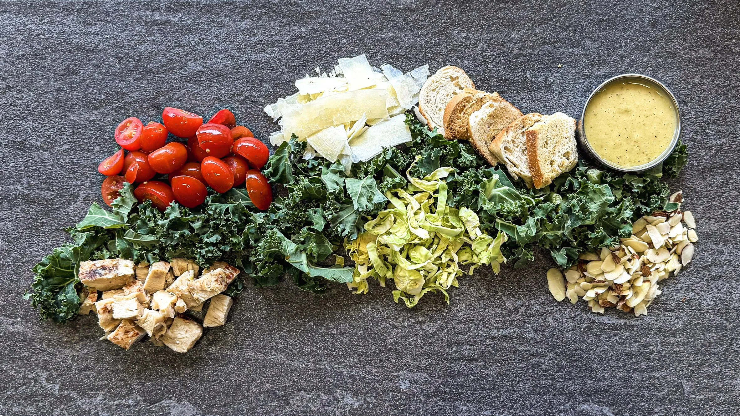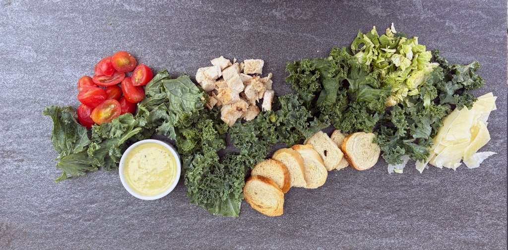 Kale / Grilled Chicken / Brussels sprouts / Shaved Parmesan Sliced Almonds / Grape Tomatoes / House-made Croutons / Lemon Caesar Dressing