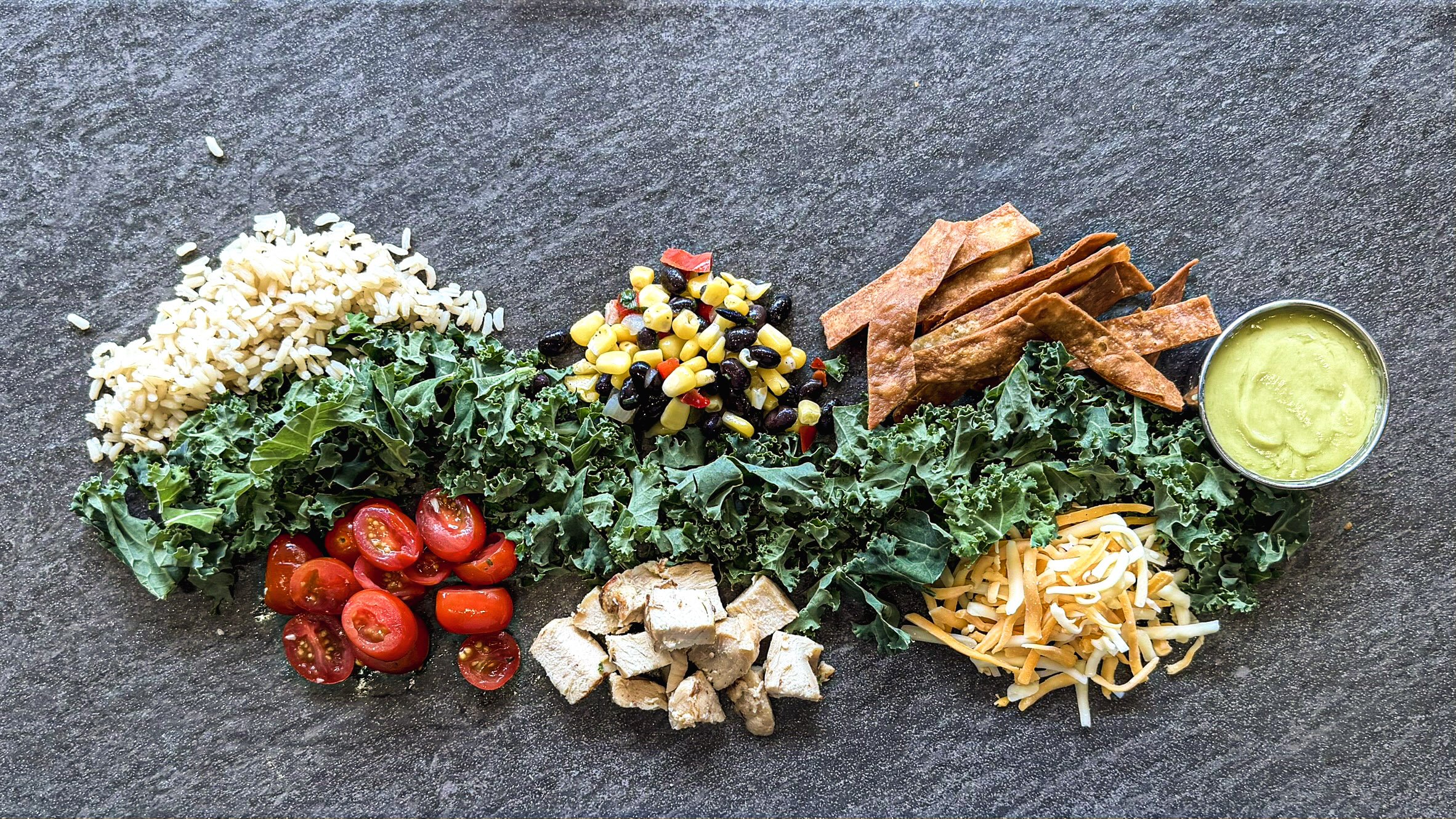 Brown Rice Blend / Grilled Chicken / Kale / Black Bean & Corn Salsa / Cheddar Jack / Grape Tomato / Tortilla Strips / Avocado Lime Dressing