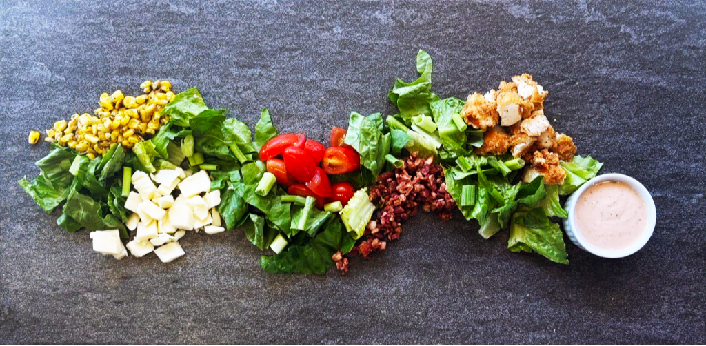 Romaine / Crispy Chicken / Bacon / White Cheddar / Roasted Corn / Scallions / Grape tomato / BBQ Ranch Dressing