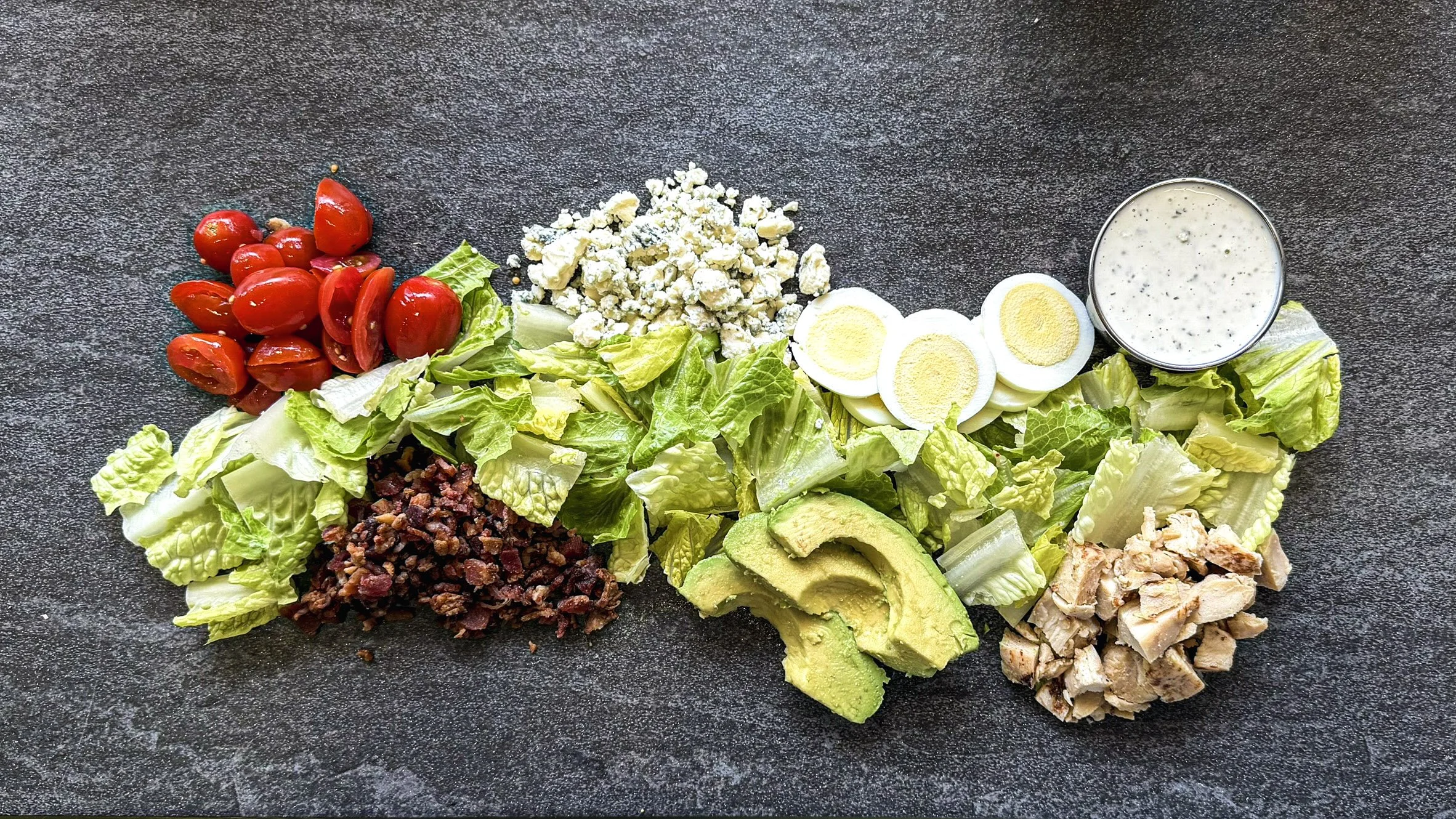 Romaine / Grilled Chicken / Bacon / Hard-boiled Egg / Avocado / Grape Tomato / Bleu Cheese / Ranch Dressing